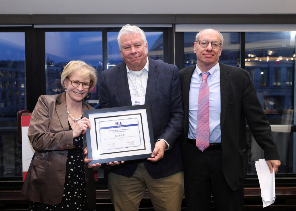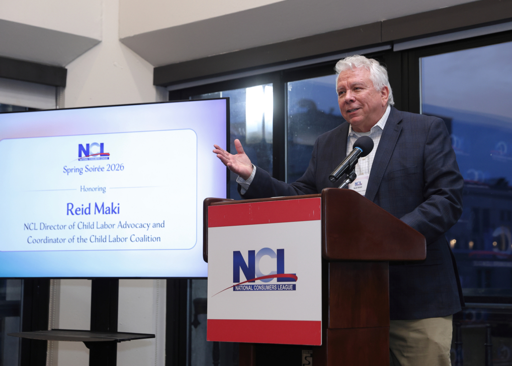 Reid Maki is honored upon his retirement for 18 years of service advancing child labor protections and championing the rights, health, and safety of vulnerable child workers in the United States and around the world. He joined the National Consumers League in March 2008, where he coordinates the activities of the Child Labor Coalition and works to combat abusive child labor practices. A strong advocate for corporate social responsibility and fair labor standards, he previously spent 12 years at the Association of Farmworker Opportunity Programs directing the Children in the Fields campaign, a joint effort to close loopholes in child labor law that allow children in agriculture to work longer hours and at younger ages than their peers in other industries. Earlier in his career, he worked as a reporter for daily and weekly newspapers. Maki earned bachelor’s and master’s degrees in American History from the University of Massachusetts at Amherst and Stanford University, respectively.