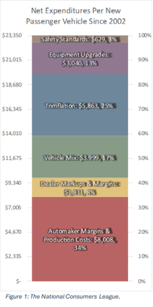 Since 2002, average expenditures per new vehicle have increased $23,349.83. Improvements in fuel economy and safety standards account for only a modest share of this increase, as follows: